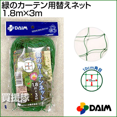 ◆サイズ:1.8m×3m 特徴 仕様商品名 緑のカーテンネット 1.8m×3mサイズ 1.8m×3m材質 ポリエステルパック内容 1.8m×3mネット 1枚JANコード 4968438012247【備考】 ・10cm各目のネットです ・緑のカーテン用替えネットです●サイズ0.8m×3mネットも御座います>>緑のカーテンネット 0.8m×3m 【緑のカーテンネット 交換 換え 替え 第一ビニール DAIM ネット】